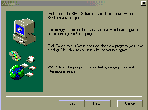 SEAL 6.1Jを起動するには、[Start]ボタン−[プログラム]ボタン− [Seal61J]とドラッグし、クリックする。また、[Start]ボタン−[プログラム]ボタンのすぐ上に、Seal61Jボタンができているので、それをクリックしてもよい。(フロッピィディスクを利用してインストールした人は、[Start]ボタン−[プログラム]ボタン−[SEAL6J]− [SEAL6J])