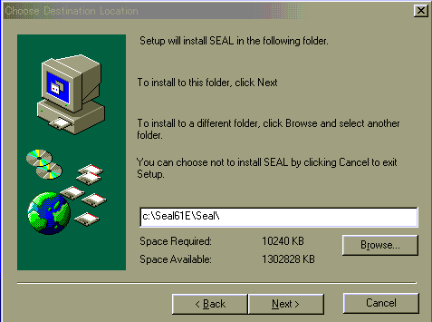 起動すると、すぐに以下のような画面が現れる。SEAL\フォルダーの位置を聞かれているので、c:\Seal61EJ\と入力し、[OK]をクリックする。最後の\を忘れると、エラーになる。なお、英語版SEALは、日本語版Windows95、98、Meで動かすと、\キーを押しても、すべてバックスラッシュで表示される。