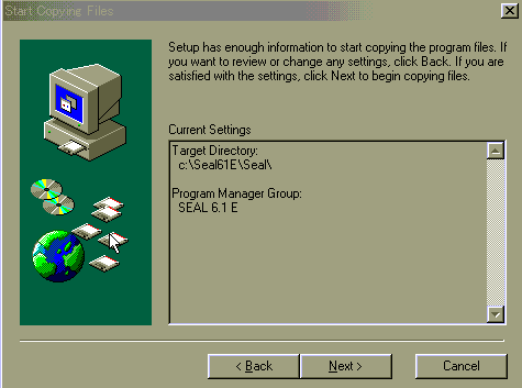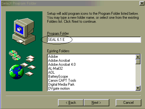 「スタート」−「プログラム」に続くメニューに登録されるグループ名をきいてくる。SEAL 6.1 E がデフォルトである。[Next]をクリックする。