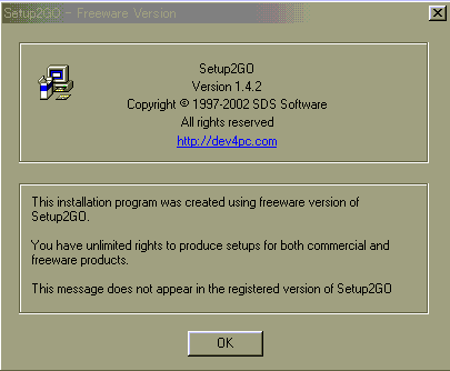 最後に、このインストールファイル作成に使ったソフトSetup2Goについてのメッセージが表示されるので、[OK]をクリックする。