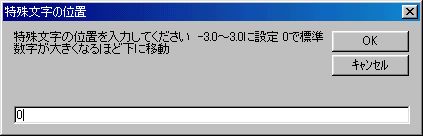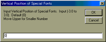 特殊文字の上下方向の位置がハードウェアに依存してずれてしまうのを修正する設定である。まず0を入力し(これが初期設定である)、特殊文字が他の文字の位置とそろっているかどうか確認する。文字が上にずれていれば正の数を、下にずれていれば負の数を入力する。入力できる値は-3.0から3.0までである(小数の形も可)。