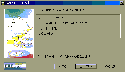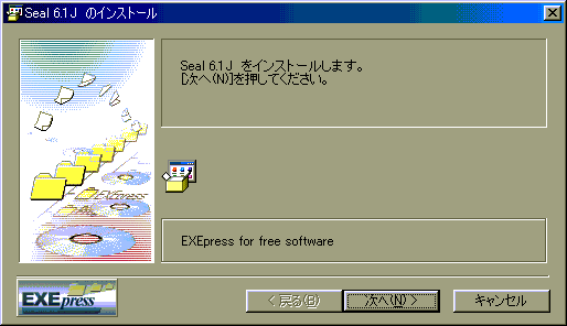 ダウンロード先のフォルダーにSeal61JSetup.exeがあることを確認して、ダブルクリックする。自動的に解凍を行う。下のような画面が現れる。[次へ]をクリックする。