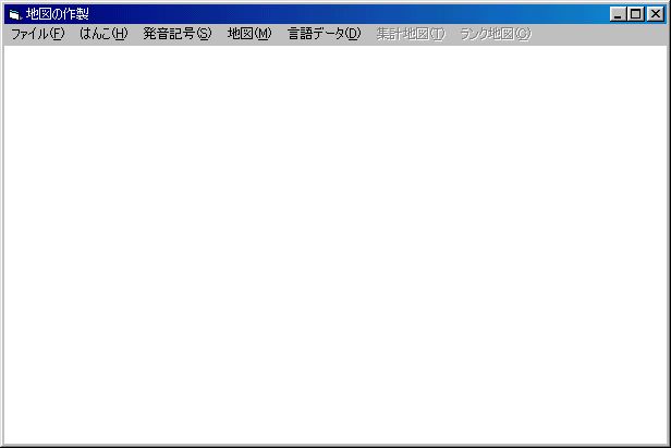 メニューバーから[地図]−[白地図]とドラッグし、クリックすると、サンプルの白地図が表示される。言語地図を描画するには、まず、[言語地図]から、[データ入力][はんこ入力]をする必要がある。それぞれ、c:\Seal61J\Seal\SealData\sanple\Lingと開いていって、表示されたファイルから選ぶ。それから[地図]−[言語地図]とドラッグし、クリックすると、「竹の皮で作った笠」の言語地図が表示される。(フロッピィディスクを利用してインストールした人はc:\Seal6J\から開く)