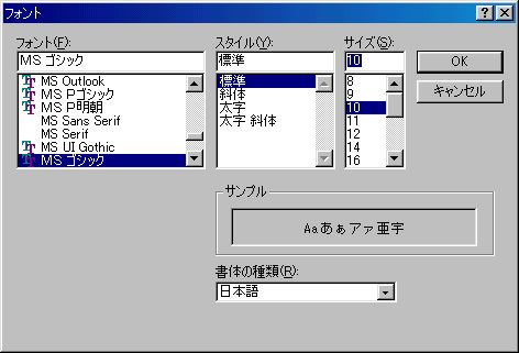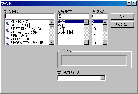 それぞれカーソルを動かしてクリックすると、選択したデータが入力される。フォント名は数が多いので、スクロールするか、頭文字のa、c、msなどを入力することにより、目当てのフォントを選ぶ。なお、先頭に$、%、&、@のついたフォントは選択できない。また、漢字を使用したいときには、書体の種類が[欧文]となっているものも選択できない。