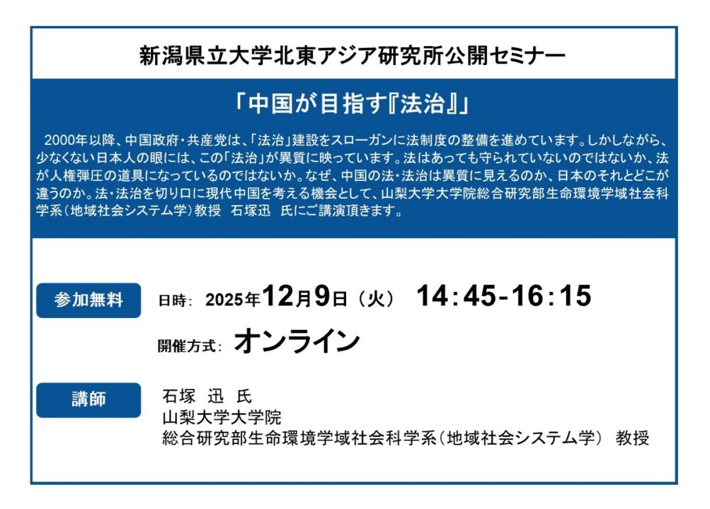 2000年以降、中国政府・共産党は、「法治」建設をスローガンに法制度の整備を進めています。しかしながら、少なくない日本人の眼には、この「法治」が異質に映っています。法はあっても守られていないのではないか、法が人権弾圧の道具になっているのではないか。なぜ、中国の法・法治は異質に見えるのか、日本のそれとどこが違うのか。法・法治を切り口に現代中国を考える機会として、山梨大学大学院総合研究部生命環境学域社会科学系(地域社会システム学)教授 石塚迅 氏にご講演頂きます。