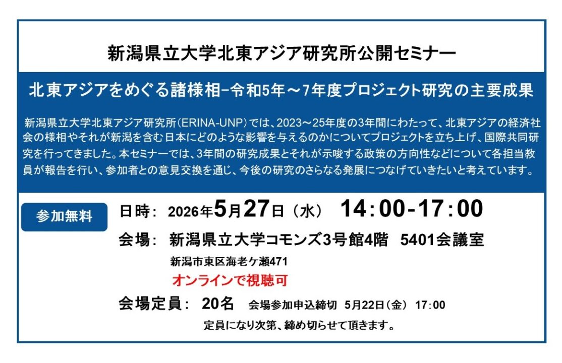 新潟県立大学北東アジア研究所(ERINA-UNP)では、2023~25年度の3年間にわたって、北東アジアの経済社会の様相やそれが新潟を含む日本にどのような影響を与えるのかについてプロジェクトを立ち上げ、国際共同研究を行ってきました。本セミナーでは、3年間の研究成果とそれが示唆する政策の方向性などについて各担当教員が報告を行い、参加者との意見交換を通じ、今後の研究のさらなる発展につなげていきたいと考えています。