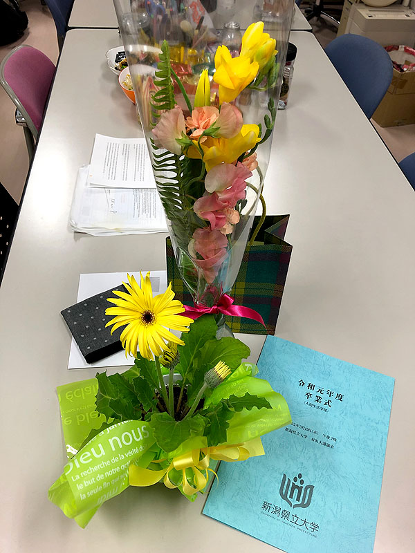 研究室メンバーにも参加できない人がいましたが、中庭で卒業記念のプレゼントを渡しただけでお別れです。