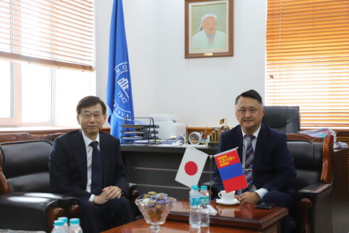 8月21日、若杉隆平学長はモンゴル国立大学を訪問し、Ochirkhuyag学長と両大学間の今後の学術協力について話し合いました。