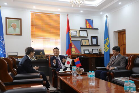 会談にはGombobaatar副学長(研究協力担当)も同席し、モンゴル国立大学内に新設された本学モンゴルオフィスの活用、本学とモンゴル国立大学との間の学生交流、食と健康に関する分野や人文社会科学分野における教育研究交流の活発化について意見が交わされました。