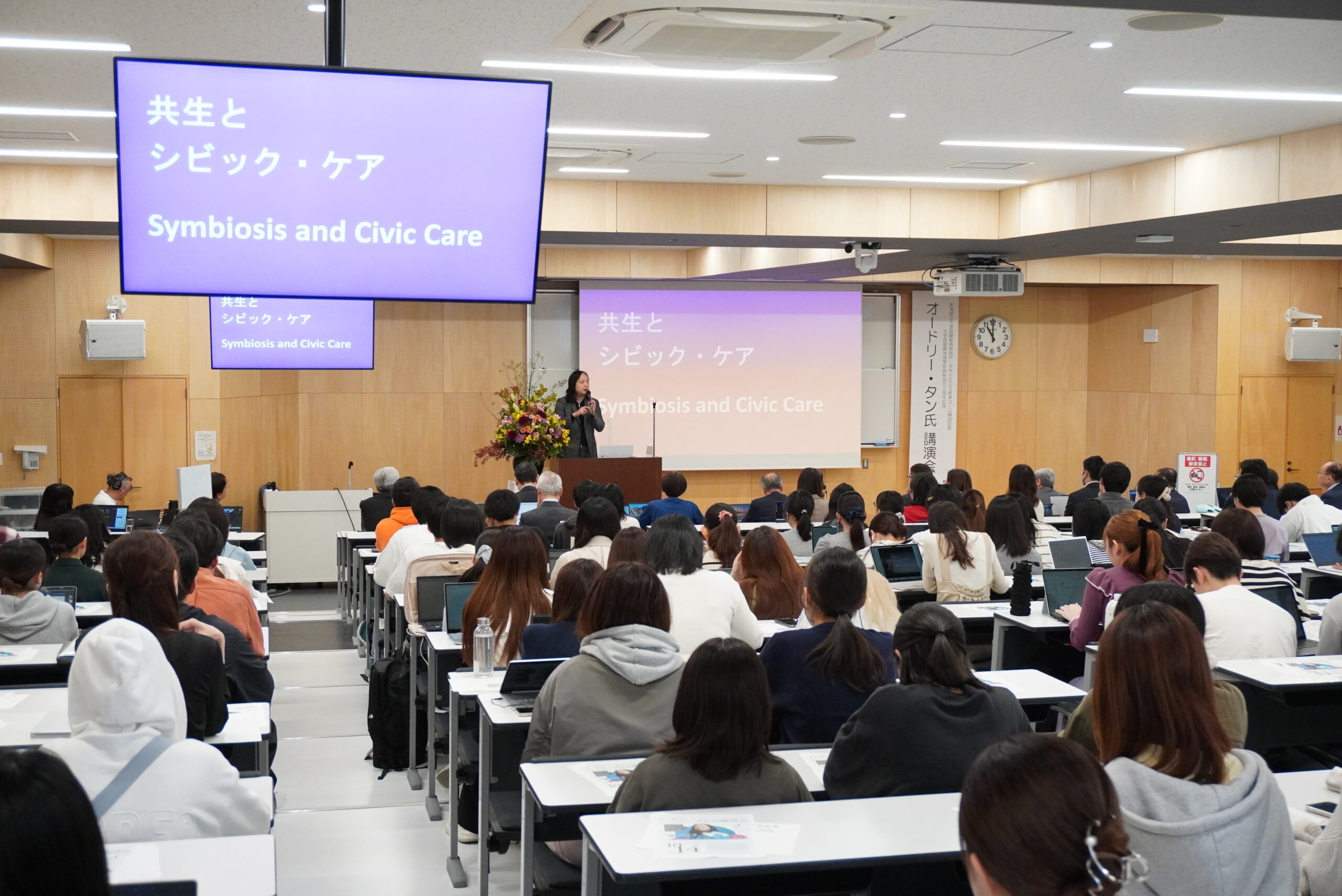台湾のサイバー大使であり初代デジタル担当大臣を務めたオードリー・タン氏をお迎えし「PLURALITY:AI時代の民主主義」と題し講演を行っていただきました。会場には来賓、学生、教職員など約200名が参加しました。